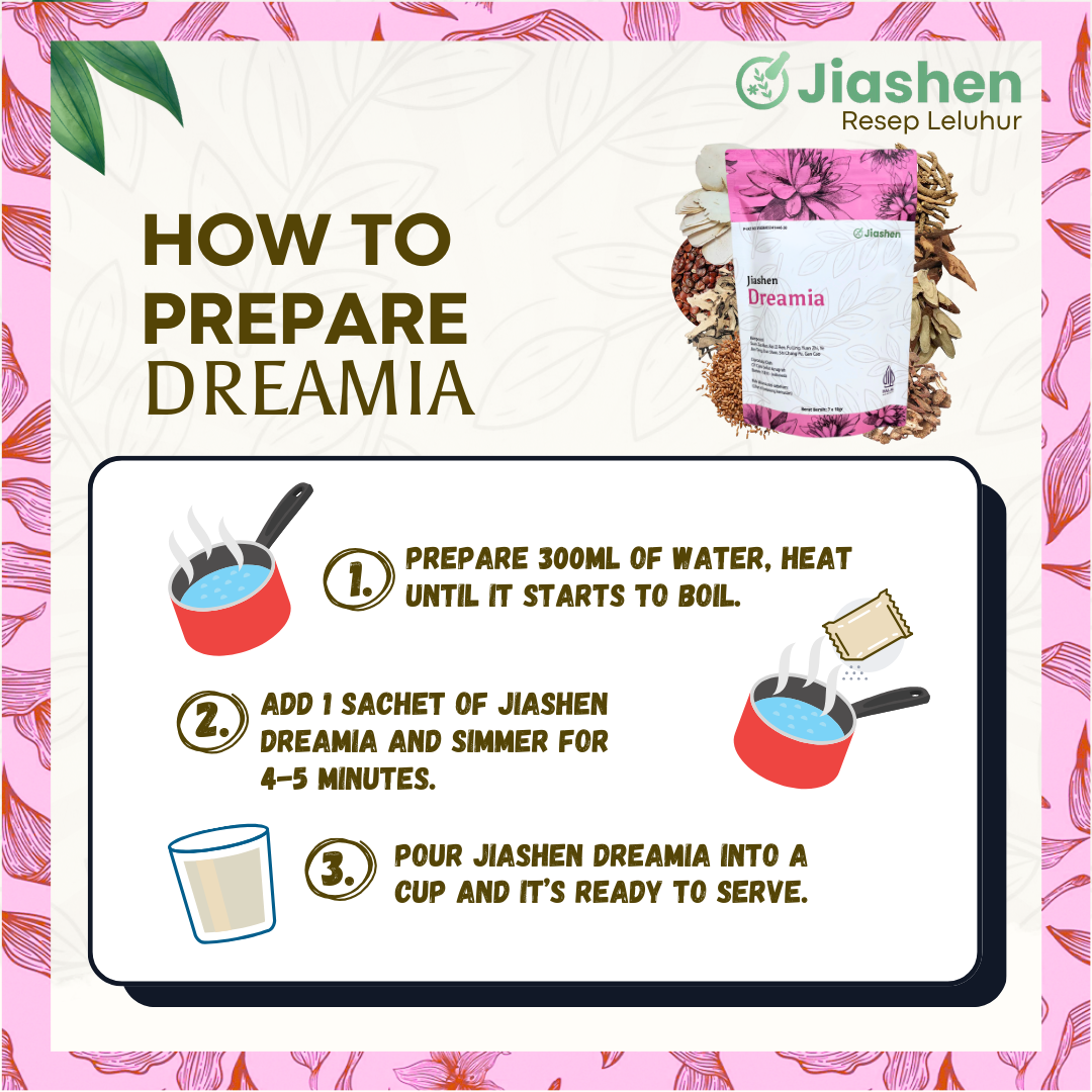 - Add 1 sachet of Jiashen Dreamia into the hot water.